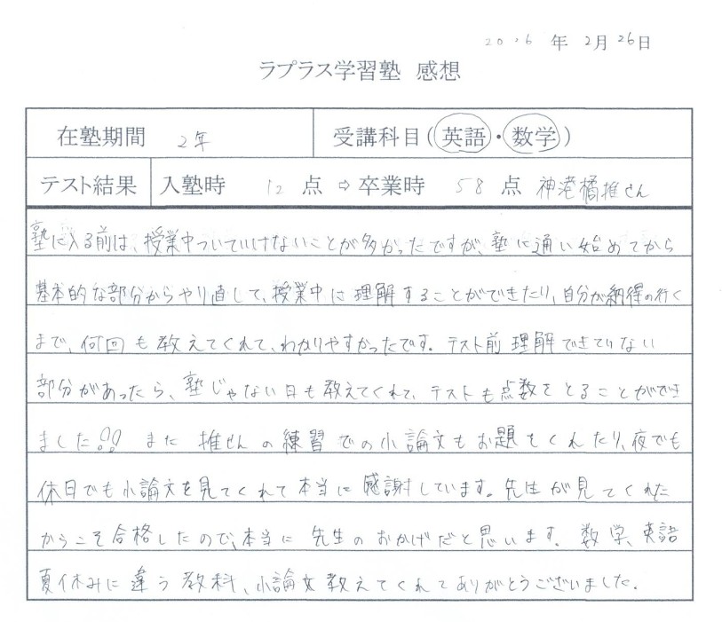ラプラス学習塾に入塾する前は、英語が大の苦手でした。でも、ラプラス学習塾に入塾し、個人に合った分かりやすく丁寧な指導によって、少しずつ理解できるようになりました。学校で分からなかった問題やワークの問題なども解説してもらい、学校の授業についていけるようになりました。本当にありがとうございました。