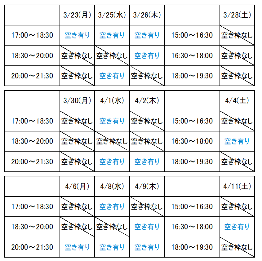 3/17現在の空き枠状況は以下となっています。お申し込みはLINEでお願いいたします。